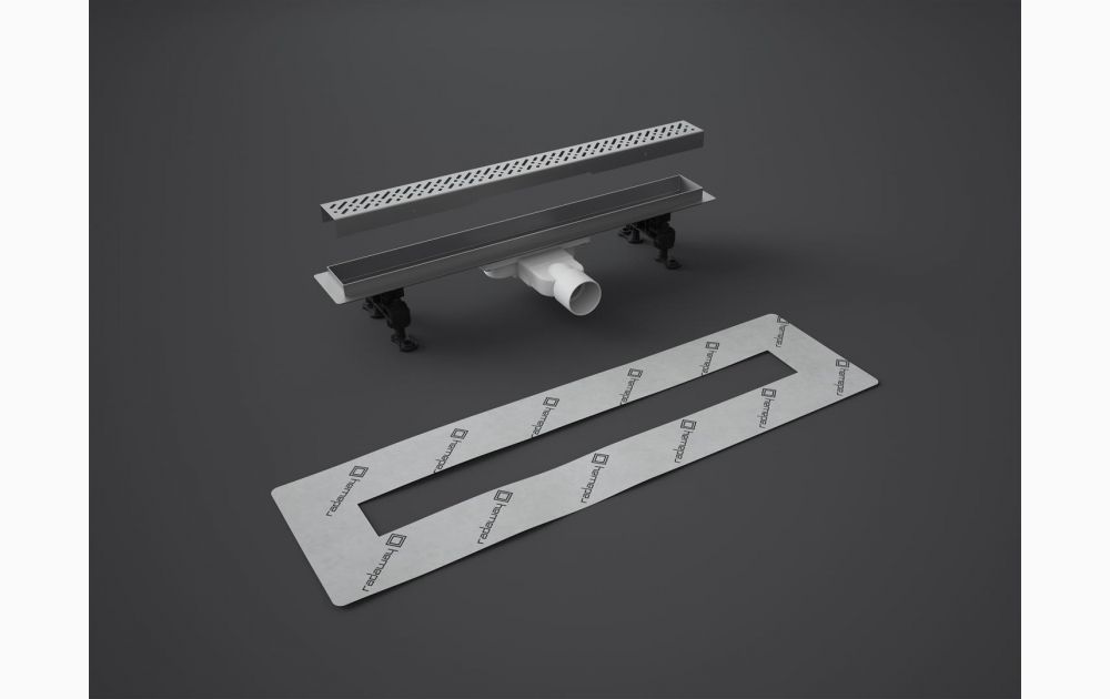 Zestaw zawiera: odpływ liniowy, syfon, nóżki regulacyjne, ruszt, mankiet z maty uszczelniającej, osadnik zanieczyszczeń oraz uszczelki.