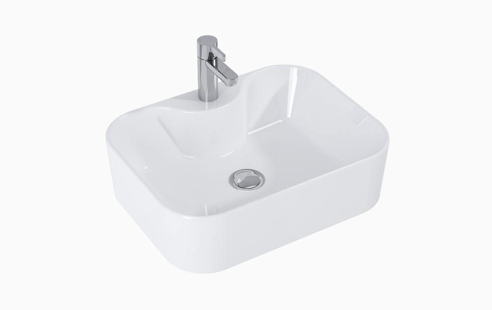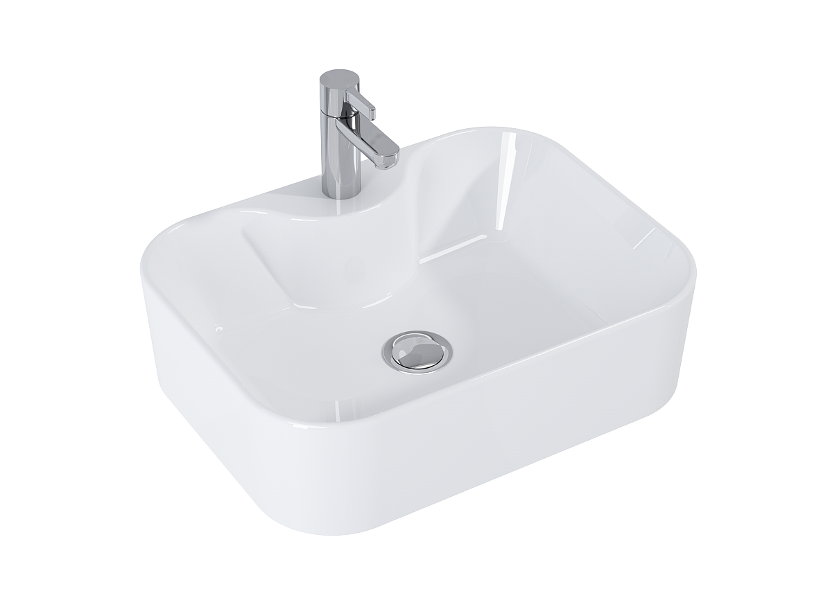 Ceramiczna umywalka nablatowa bez przelewu z otworem na baterię. Umywalka ma przygotowany otwór na baterię, a mimo to misa umywalki nie jest zmniejszona. Wyprofilowany kształt misy z występem jedynie w miejscu baterii sprawia, że umywalka wygląda oryginalnie i ciekawie.