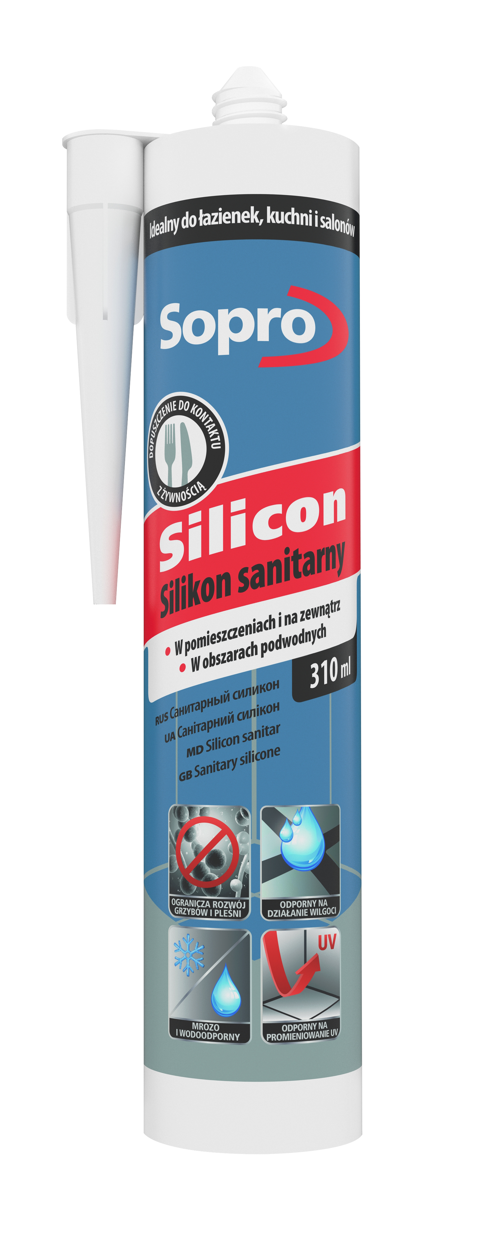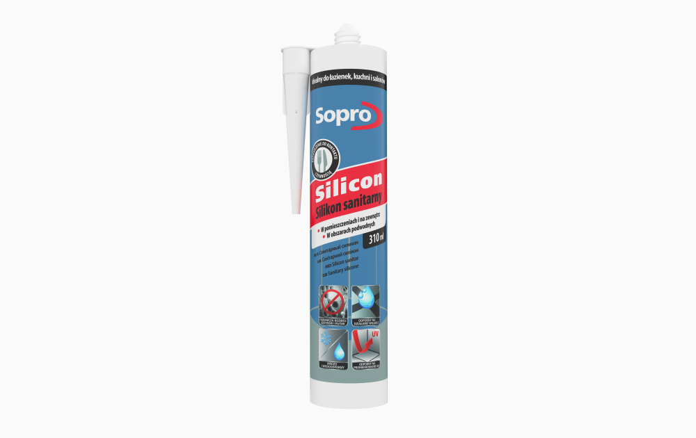 Trwale elastyczny, sieciujący kwasem octowym, bez zawartości oksymów, odporny na oddziaływanie chemikaliów, silikonowy materiał do uszczelniania i elastycznego wypełniania szczelin łączących i dylatacyjnych w obszarach sanitarnych, jak również na balkonach, tarasach i basenach kąpielowych.