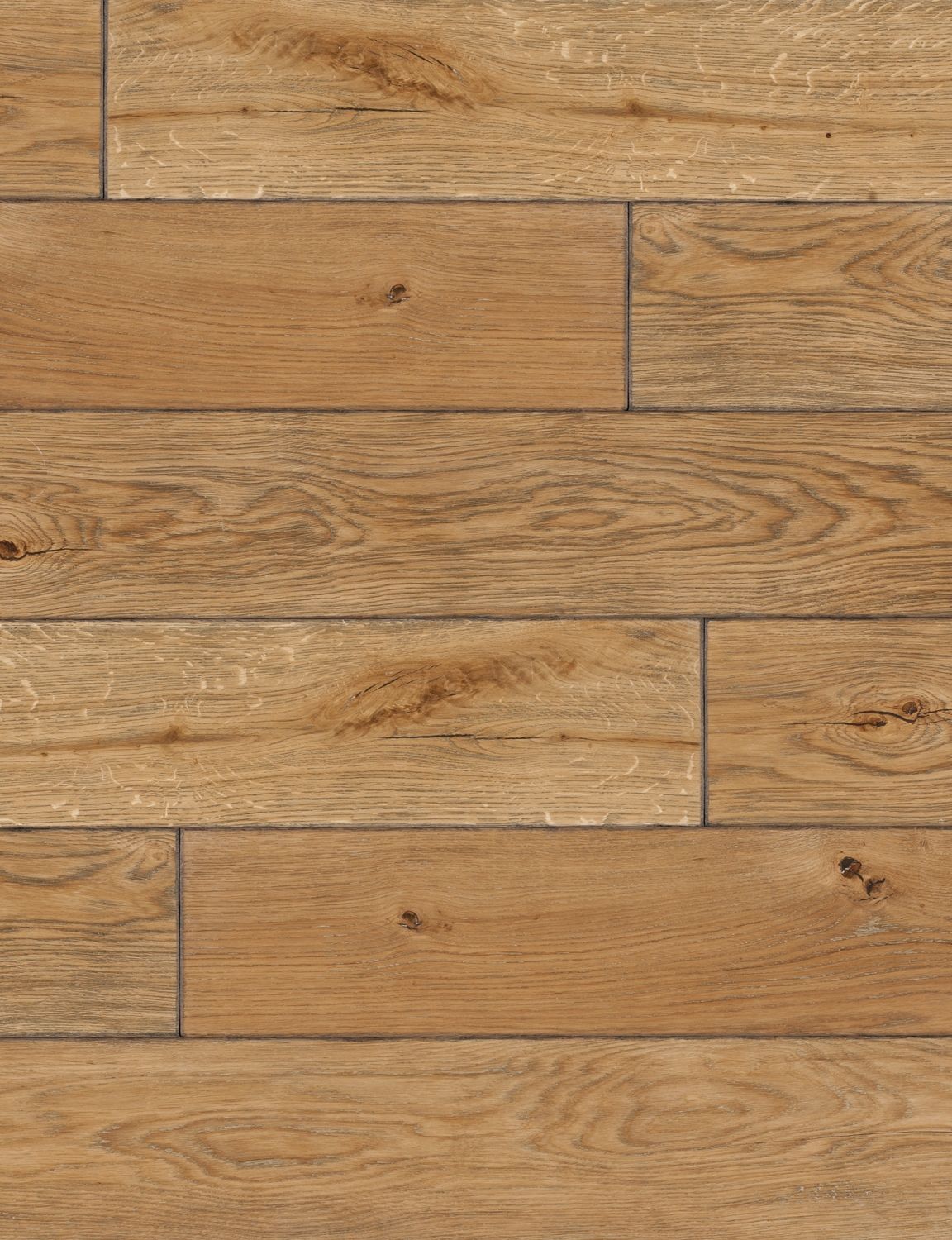 Podłoga dębowa. Struktura drewna wyraźnie zaznaczona dzięki procesowi szczotkowania i heblowania. Duża zmienność odcieni pomiędzy deskami.