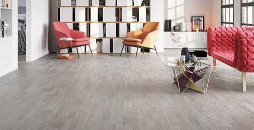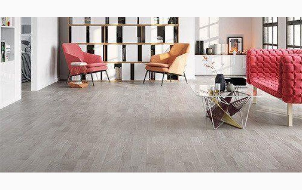 Deski barwione na odcień popielu - pokryte matowym lakierem, naturalna struktura drewna podkreślona przez szczotkowanie.