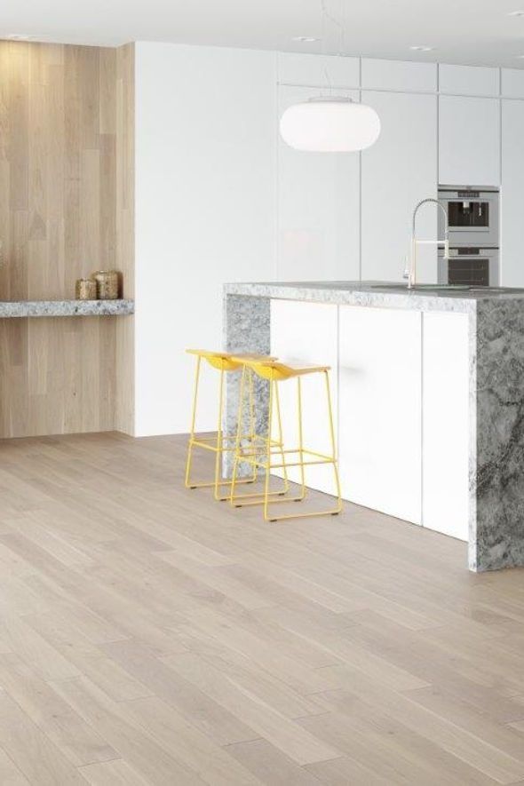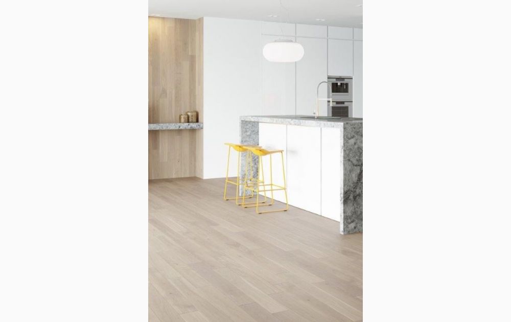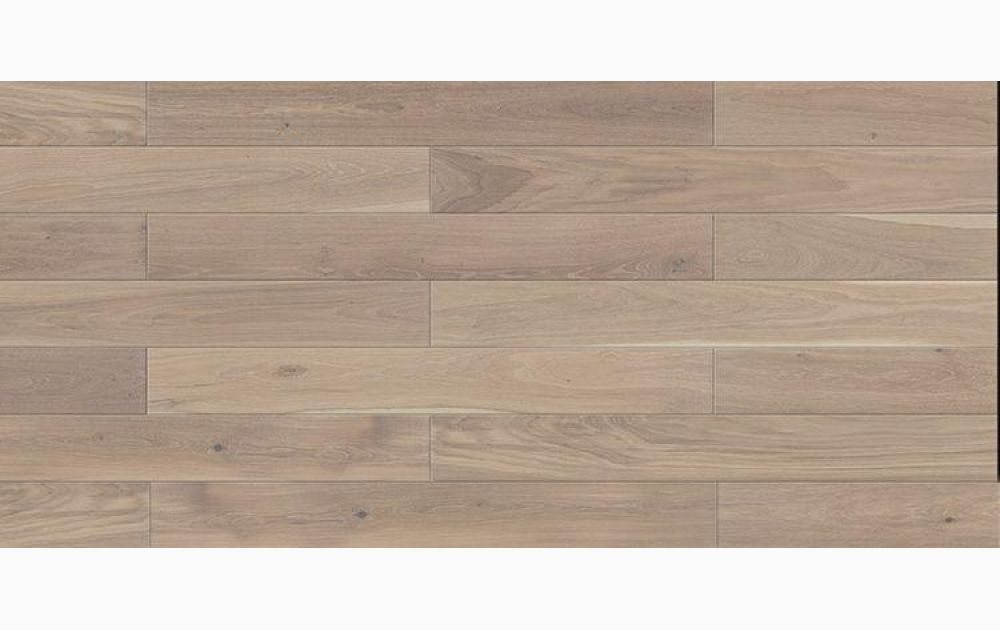 Postarzana deska o mleczno-kokosowym zabarwieniu z naturalnym rysunkiem drewna. Lekko ścięte krawędzie (fazowanie) optycznie ją wydłużają.