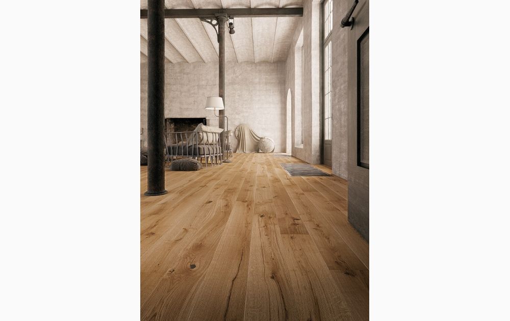 Ważną rolą we wnętrzu stanowi dębowa podłoga EXCITE, której wyrazisty rysunek determinuje klimat pomieszczenia.