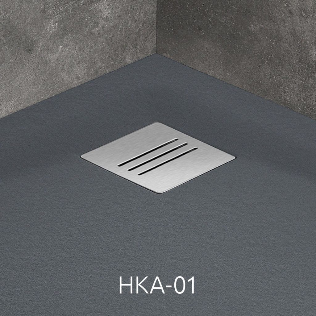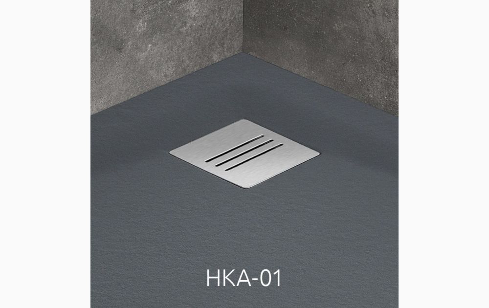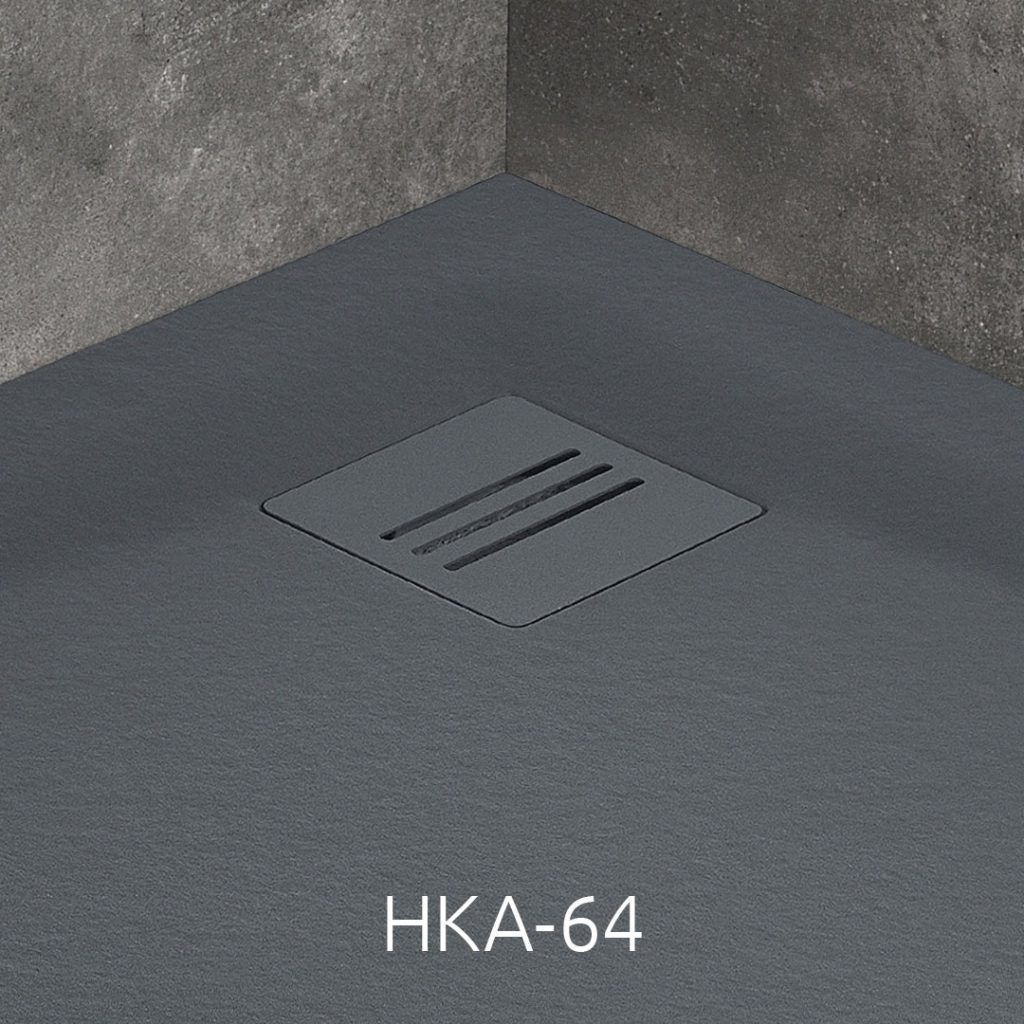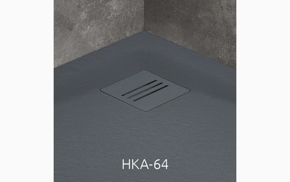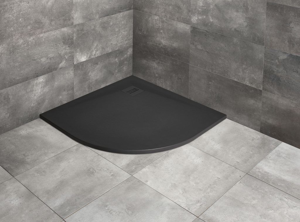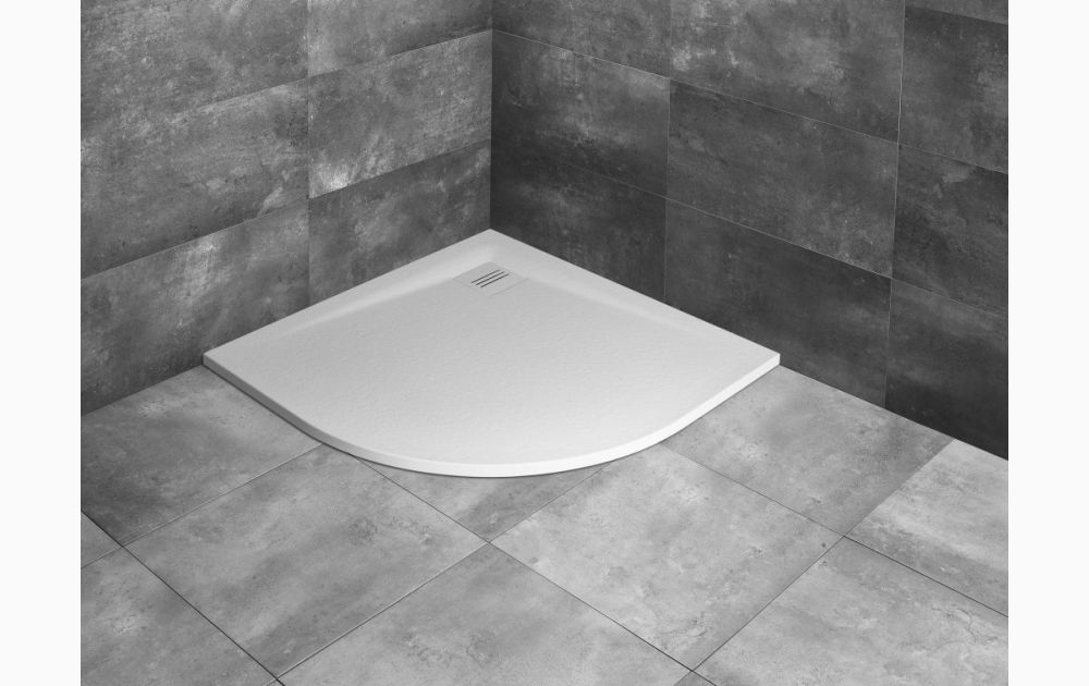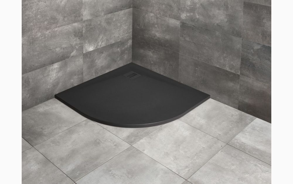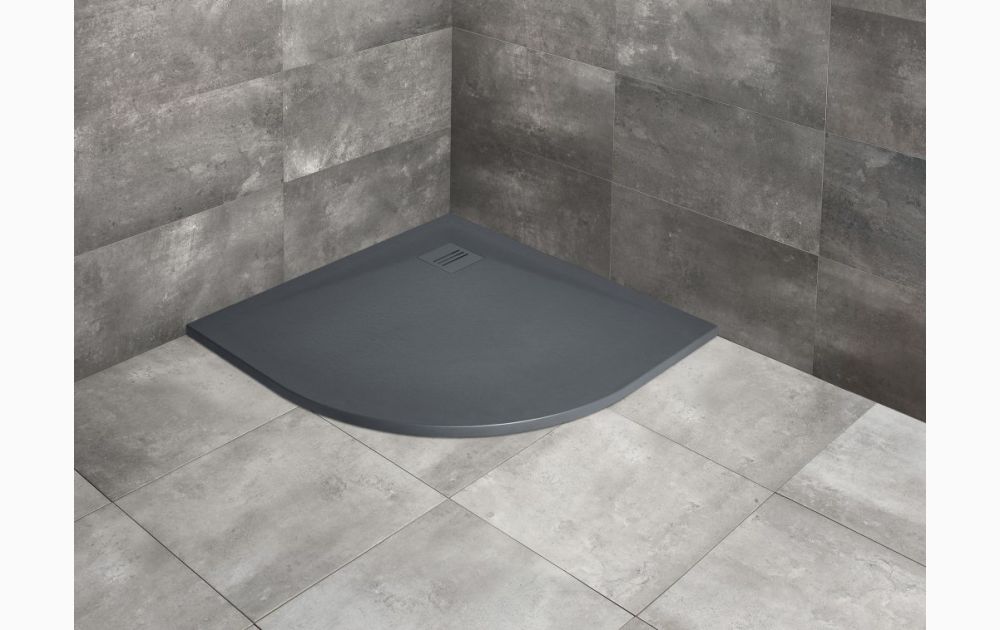 Brodzik Kyntos A półokrągły występuje w kolorach antracytowym, szarym i białym, wykonany jest z konglomeratu marmurowego. Brodzik można wbudować w podłogę i zlicować z poziomem płytek. Konglomeraty posiadają dużą wytrzymałość na nacisk. Brodzik posiada powierzchnię o właściwościach antypoślizgowych. Wysokość brodzika 30 mm, średnica odpływu Ø 90 mm. Kratkę syfonu można również wybrać w pasujących kolorach.