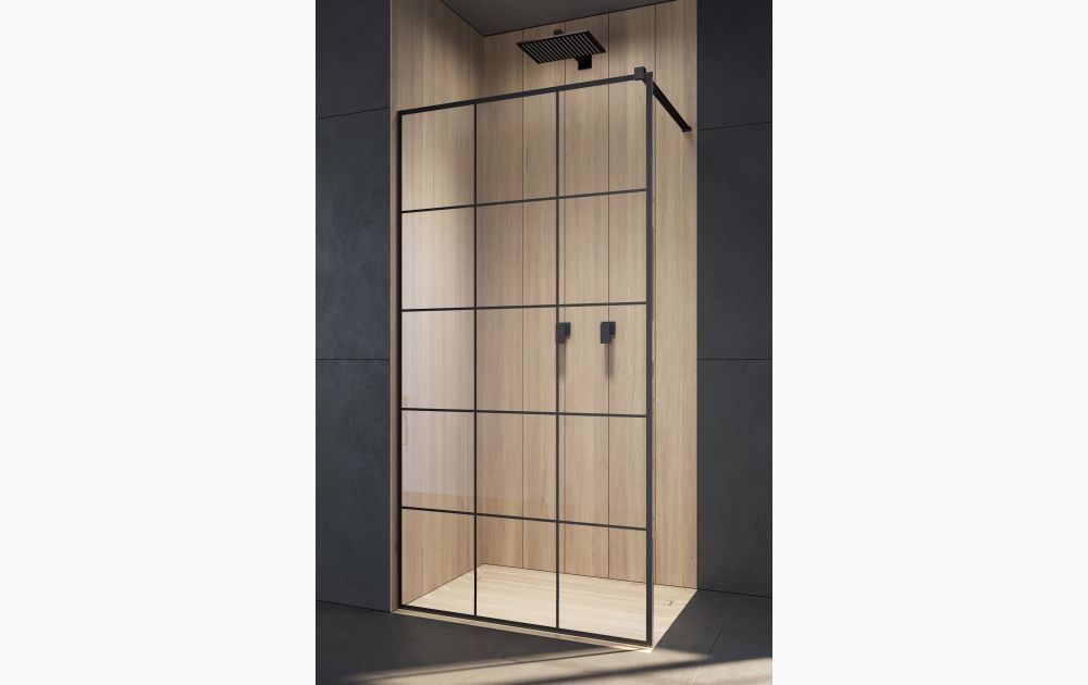 Walk-in Modo New Black II Factory charakteryzuje czarna kratownica wykonana farbą ceramiczną. Modo New występuje w rozmiarach od 50cm do 130cm. Ścianki wykonane są z hartowanego szkła o grubości 8mm i pokryte powłoką Easy Clean, dzięki czemu bardzo łatwo jest utrzymać kabinę w czystości. Czarna kratownica imitująca metalowo-szklane konstrukcje podkreśli industrialny charakter łazienki. Istnieje możliwość zamontowania ścianki na brodziku lub bezpośrednio na posadzce.