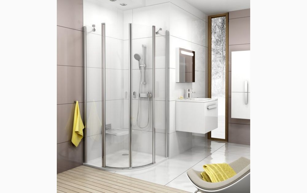 Półokrągła kabina Chrome CSKK4 posiada szkło o grubości 6mm z powłoką AntiCalc, która wytwarza na szkle niewidzialną powłokę odpychającą wodę i chroniącą szkło przed trwałym osadzaniem się nieczystości, w tym kamienia wodnego. Klasyczne zawiasy zastąpiono obrotowym słupkiem, który ułatwia otwieranie drzwi.