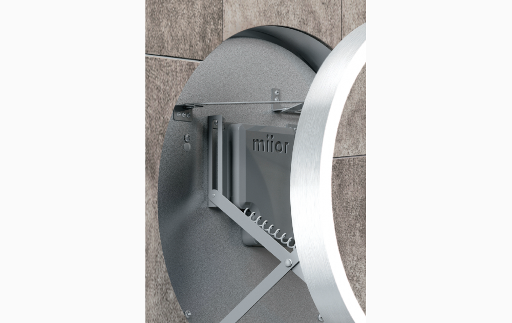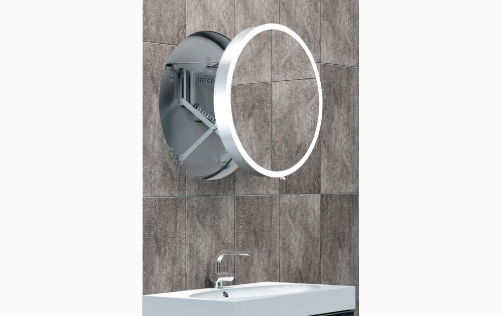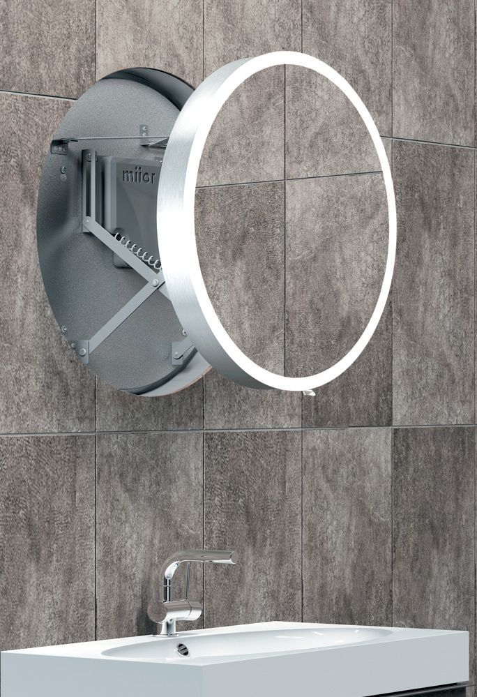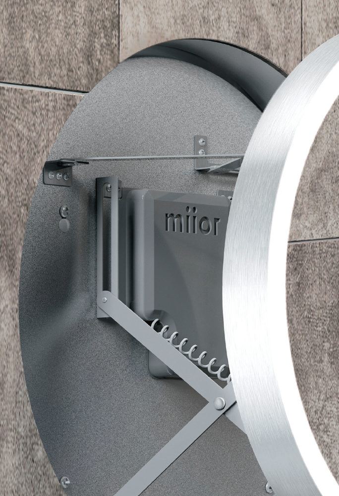 Lustro Inn Miior to nowoczesne lustro wysuwne z oświetleniem led, którego dodatkowym atutem jest modny okragły kształt oraz możliwość wbudowania lustra w ścianę i zlicowania go z płytkami. Lustro ma średnicę 60cm. Maksymalne wysunięcie do 26,5cm od powierzchni ściany. Istnieje możliwość wyboru barwy światła (ciepłe, neutralne, zimne). Dostępne w trzech wariantach kolorystycznych białym, srebrnym lub czarnym.