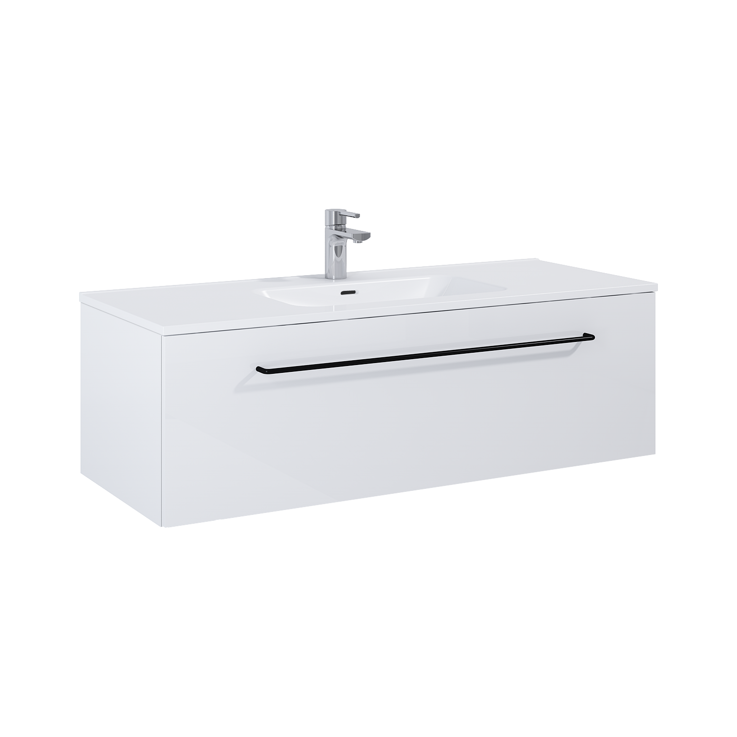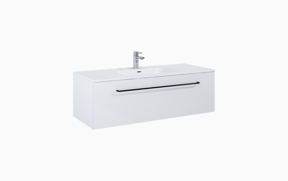 Szafka Futuris posiada jedną, dużą szufladę z cichym samodomykaczem oraz pełnym wysuwem. Została wykonana z płyty laminowanej, polerowanej na wysoki połysk. Uchwyty są metalowe w kolorze czarny mat. Metalowe nogi sprzedawane są oddzielnie. Szafka może być kompletowana z umywalką meblową, bądź dzięki możliwości dopasowania blatu- może być zastosowana pod umywalkę nablatową. Produkt posiada 2-letnią gwarancję.