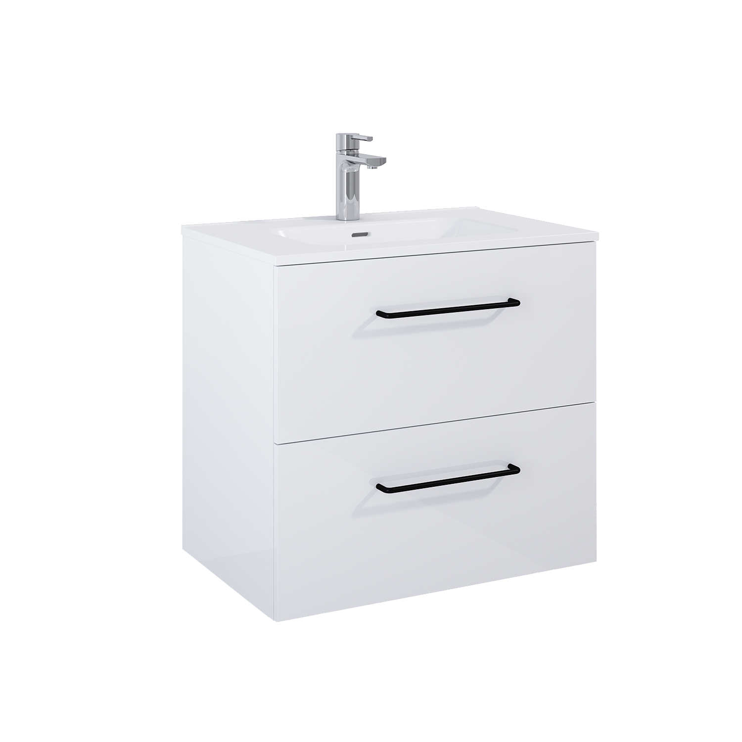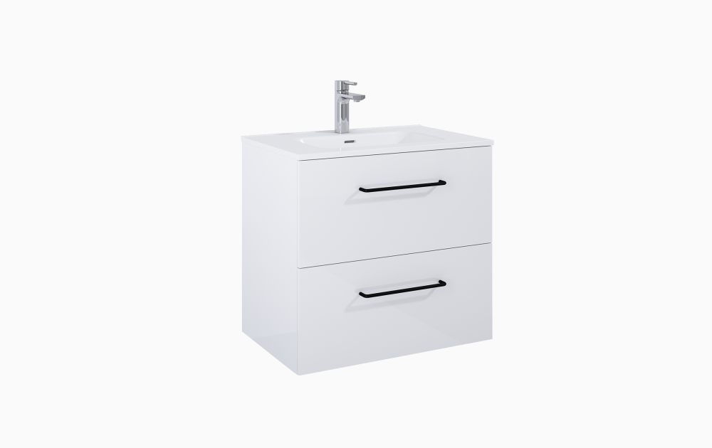 Szafka Futuris posiada dwie szuflady z cichym samodomykaczem oraz pełnym wysuwem. Front i korpus wykonane z płyty laminowanej, polerowanej na wysoki połysk. Uchwyty są metalowe w kolorze czarny mat. Metalowe nogi sprzedawane są oddzielnie. Szafka może być kompletowana z umywalką meblową, bądź dzięki możliwości dopasowania blatu- może być zastosowana pod umywalkę nablatową. Produkt posiada 2-letnią gwarancję.