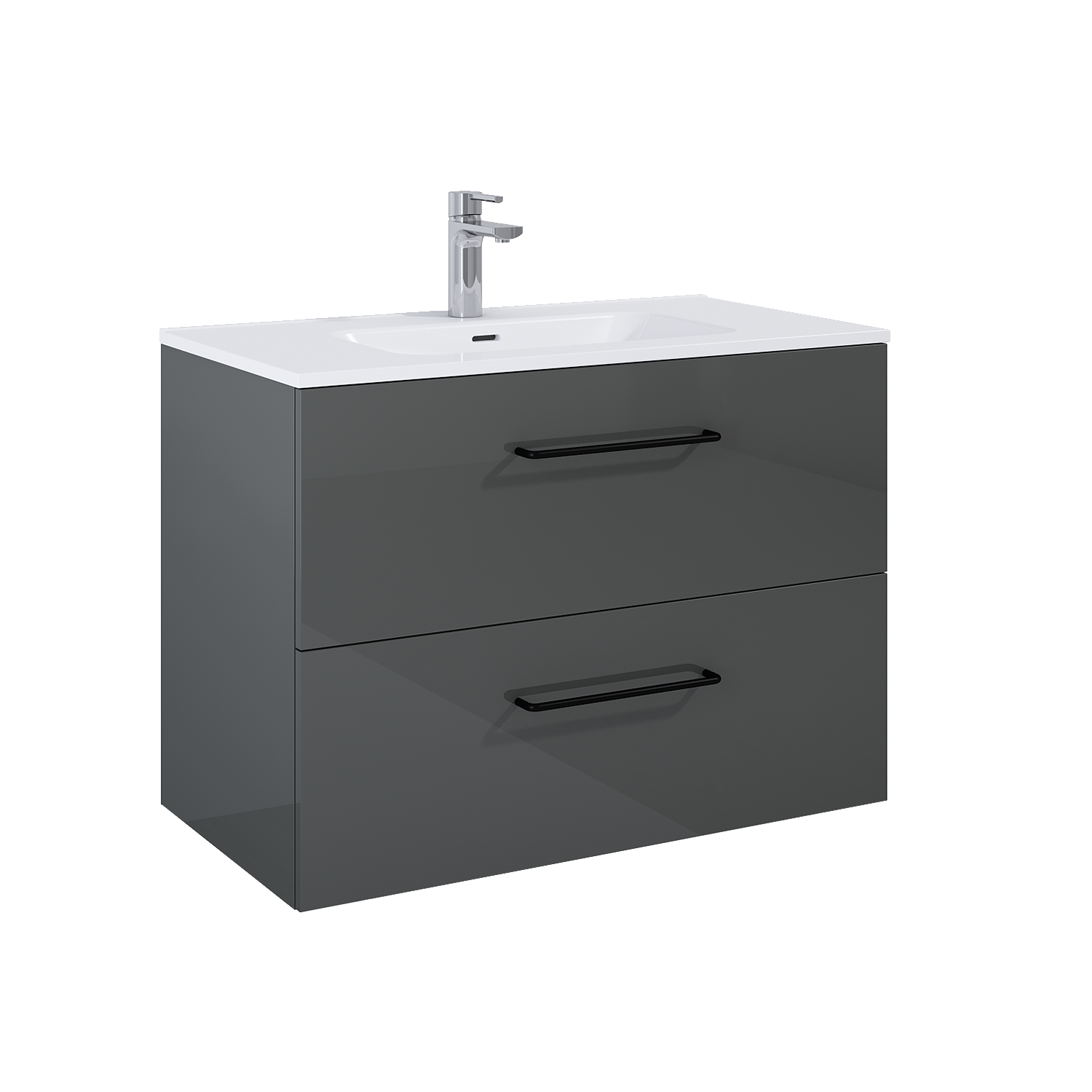 Szafka Futuris posiada dwie szuflady z cichym samodomykaczem oraz pełnym wysuwem. Front i korpus wykonane z płyty laminowanej, polerowanej na wysoki połysk. Uchwyty są metalowe w kolorze czarny mat. Metalowe nogi sprzedawane są oddzielnie. Szafka może być kompletowana z umywalką meblową, bądź dzięki możliwości dopasowania blatu- może być zastosowana pod umywalkę nablatową. Produkt posiada 2-letnią gwarancję