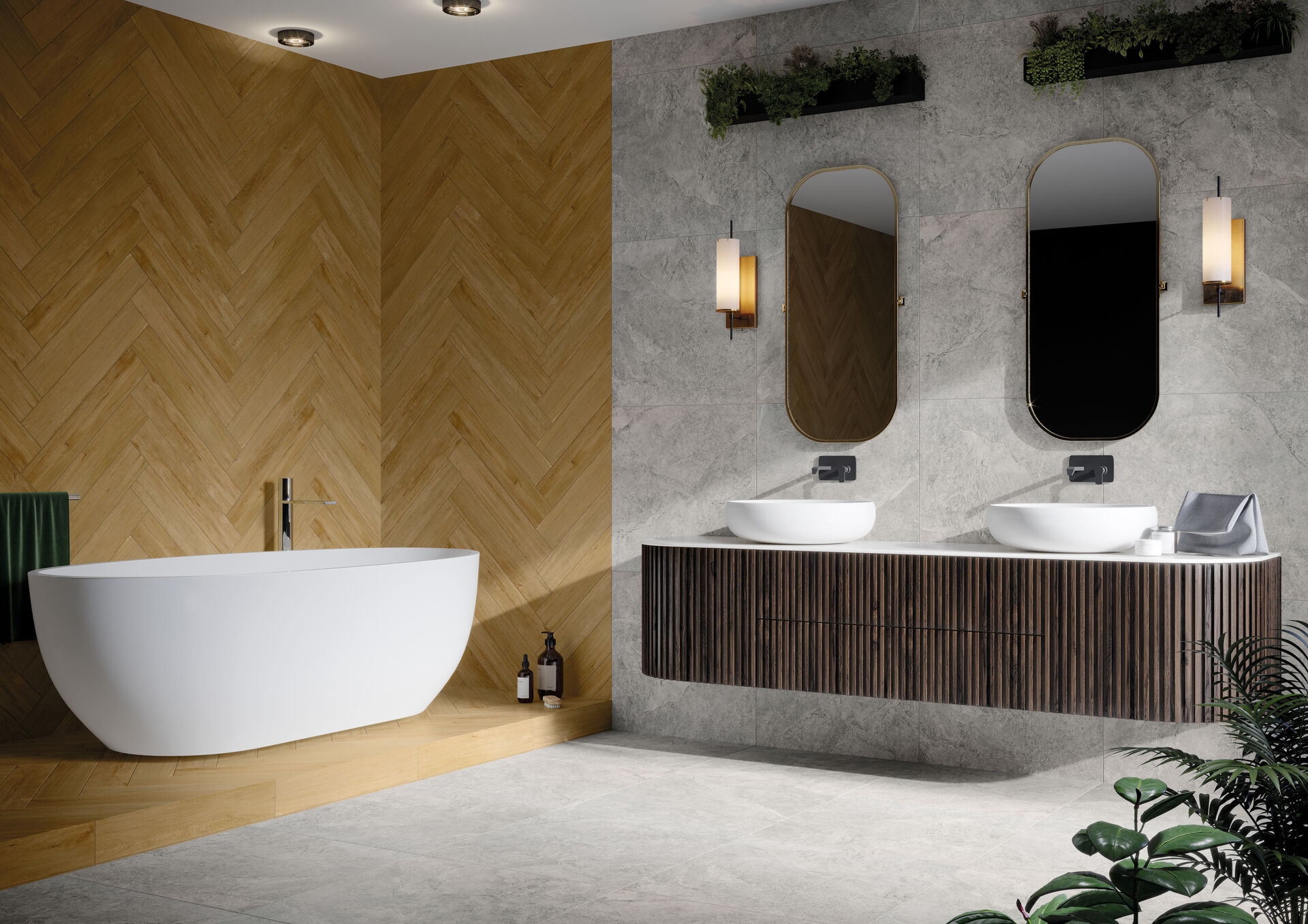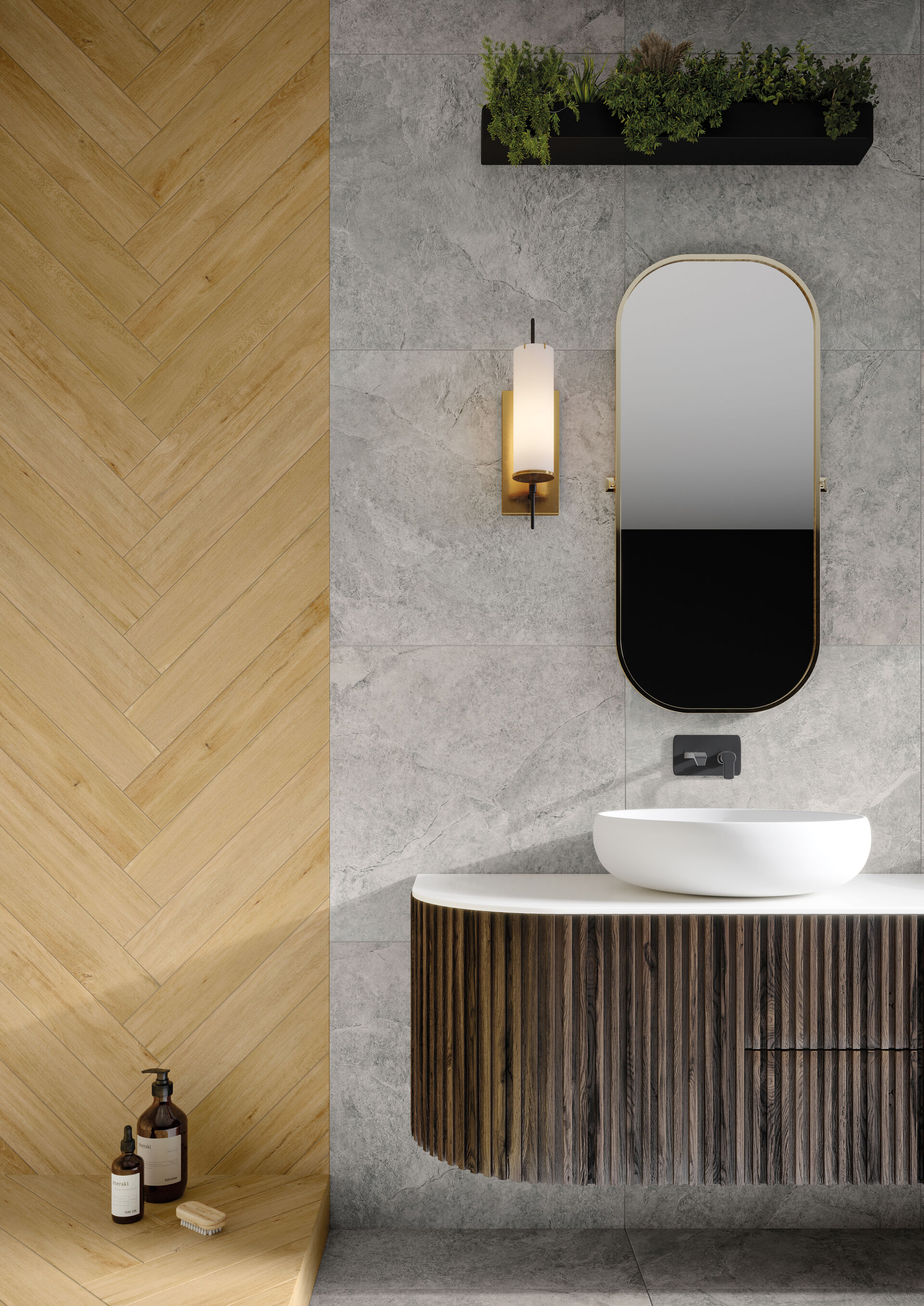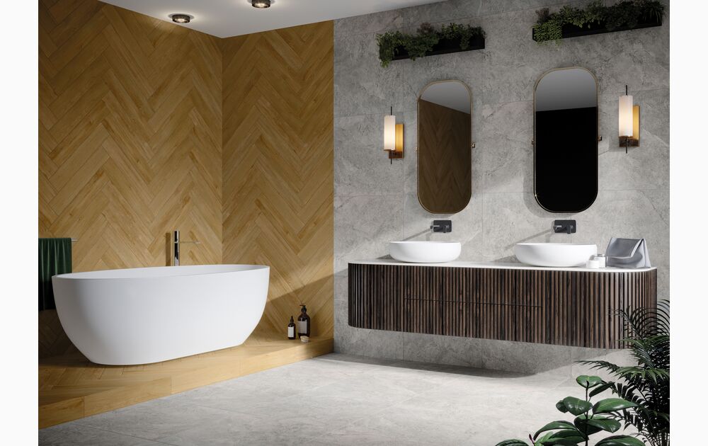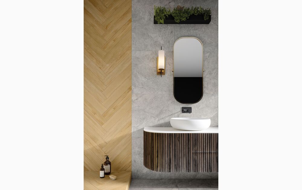 Kolekcja Lapide to wierna imitacja drewna o rozmiarze klepek parkietowych. Płytki Lapide pięknie prezentują się ułożone w modną jodełkę. Naturalne odcienie beżu i ciemnego brązu ocieplą każdą aranżację, a dzięki możliwości ułożenia jodełki zyskamy oryginalny charakter.