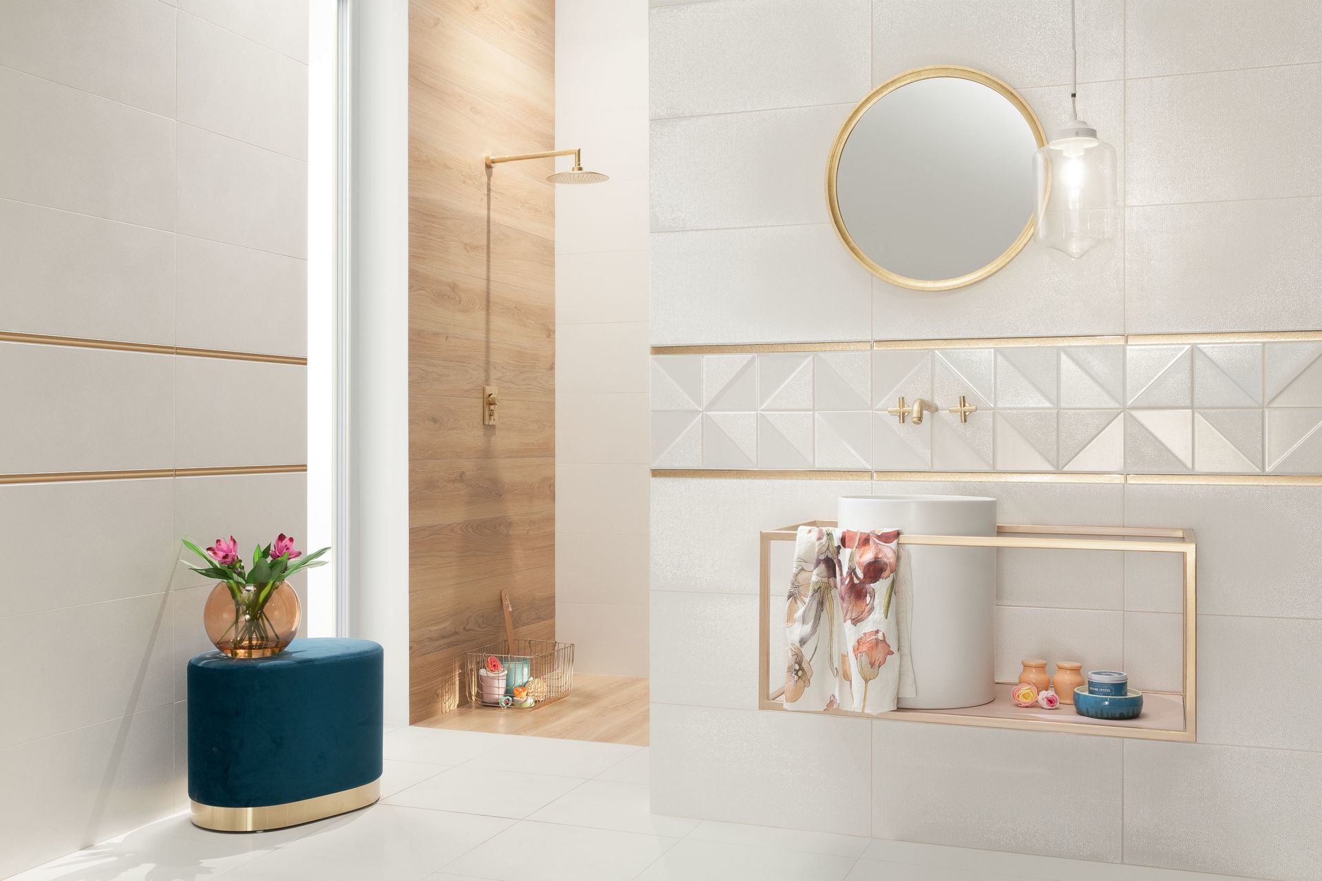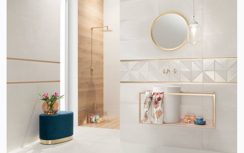 Płytka dekoracyjna Reflection w formie kwadratu 14,8 cm x 14,8 cm dostępna w 3 kolorach. Mieszając dostępne warianty kolorystyczne możemy uzyskać bardzo ciekawy efekt końcowy. Dekor Reflection występuje w wersji White 2 – biała płytka o perłowym wykończeniu, Navy 2 – granatowa płytka o perłowo-granatowym wykończeniu oraz Navy 3 – granatowa płytka z dodatkiem złota. Układając płytki w nieregularny sposób możemy tworzyć niepowtarzalne kompozycje.