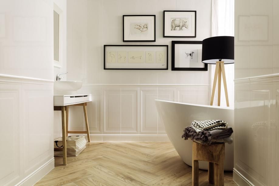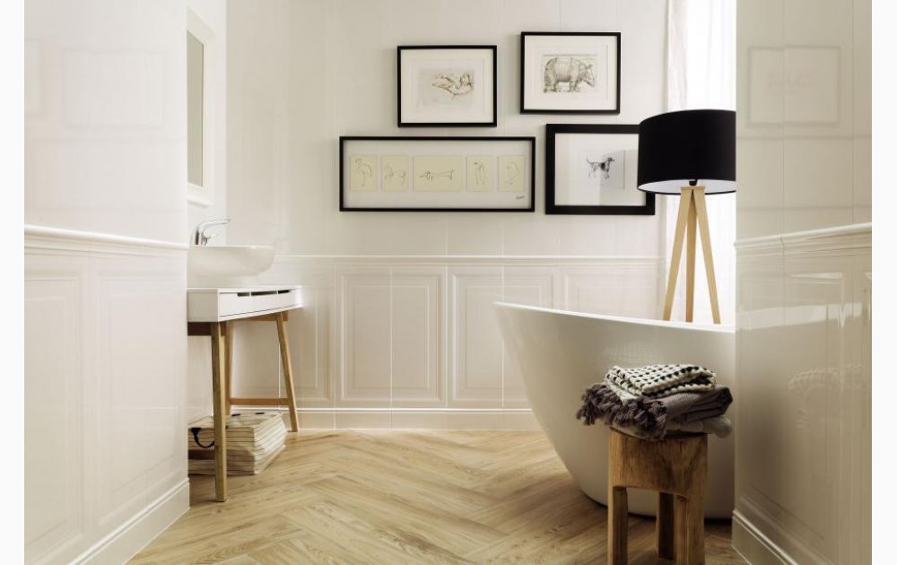 Kolekcja Royal Place z Ceramiki Tubądzin to absolutna klasyka. Cała kolekcja oparta jest na zestawieniu bieli z drewnem, czyli na ciągle aktualnym i ponadczasowym połączeniu kolorystycznym. Mocno rozbudowana kolekcja pozwoli na zaprojektowanie łazienki w różnych stylach. Wykorzystując płytkę ścienną imitującą klasyczne drewniane kasetony i płytkę podłogową ze ściętymi narożnikami, uzupełnioną drewnopodobnymi kostkami otrzymamy wnętrze w stylu vintage o niesamowitym klimacie. Miłośnikom nowoczesnych, ale przytulnych stylizacji do gustu przypadną płytki strukturalne o bardziej geometrycznych kształtach w wersji białej lub drewnopodobnej.