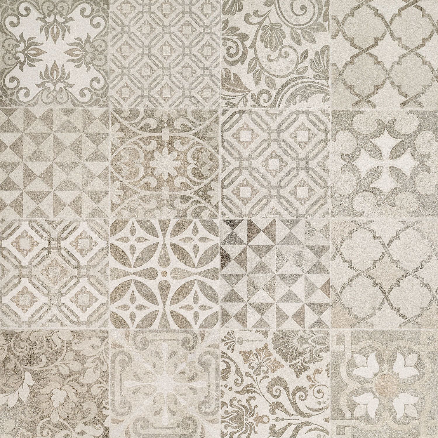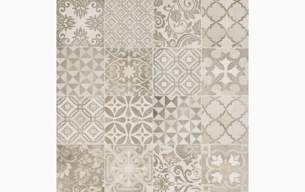 Gresowa płytka podłogowa z kolekcji Sfumato marki Tubądzin. Płytka patchworkowa o wymiarach 59,8x59,8 cm o wzorze imitującym zbiór 16 małych płytek o różnych wzorach. Cała kolekcja utrzymana jest w ciepłych odcieniach beżu i szarości.