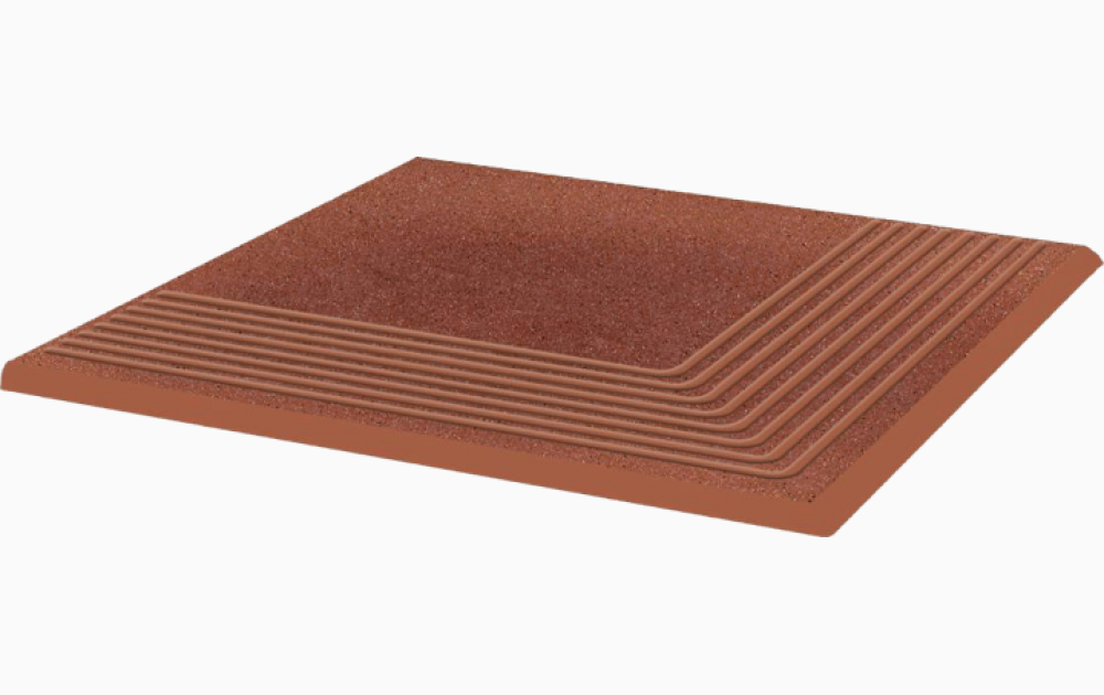 Taurus rosa 30x30 – płytka klinkierowa ryflowana, w ciepłym czerwono-rudym odcieniu balkony, przeznaczona na schody, w kolekcji są również płytki bazowe, stopnice naroże oraz płytki elewacyjne. Duża ilość płytek w kolekcji daje możliwość eleganckiego wykończenia elewacji.